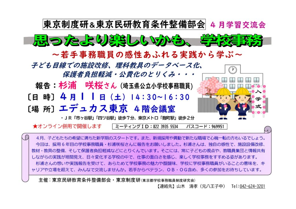 地域制度研の活動を紹介するページです 東京制度研の3月例会が行われます 日時:2026年4月11日(土)14:30~16:30 会場:エデュカス東京 4階会議室 ※オンライン参加できます 参加費:無料 詳しくは下記ファイルをご覧ください
